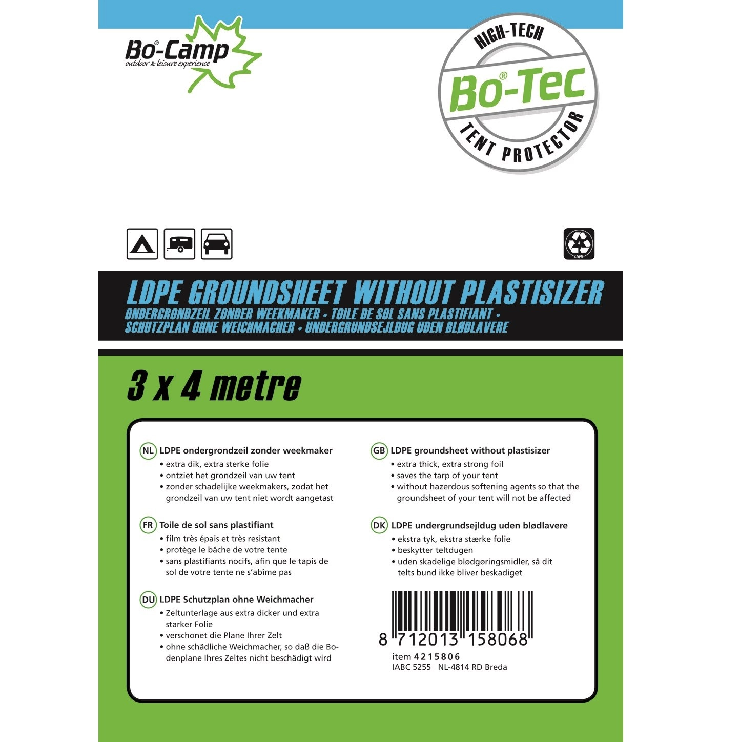 Extra sterk ondergrondzeil. Zorgt dat het grondzeil van de tent niet vies wordt en dat optrekkend vocht wordt tegengehouden, zodat alle kampeerspullen droog blijven. Ook handig om iets mee af te dekken tegen de regen. Bevat geen weekmakers zodat de coating van het grondzeil niet wordt aangetast. Gemaakt van 0,03 millimeter ‘low density polyethyleen’ (LDPE).